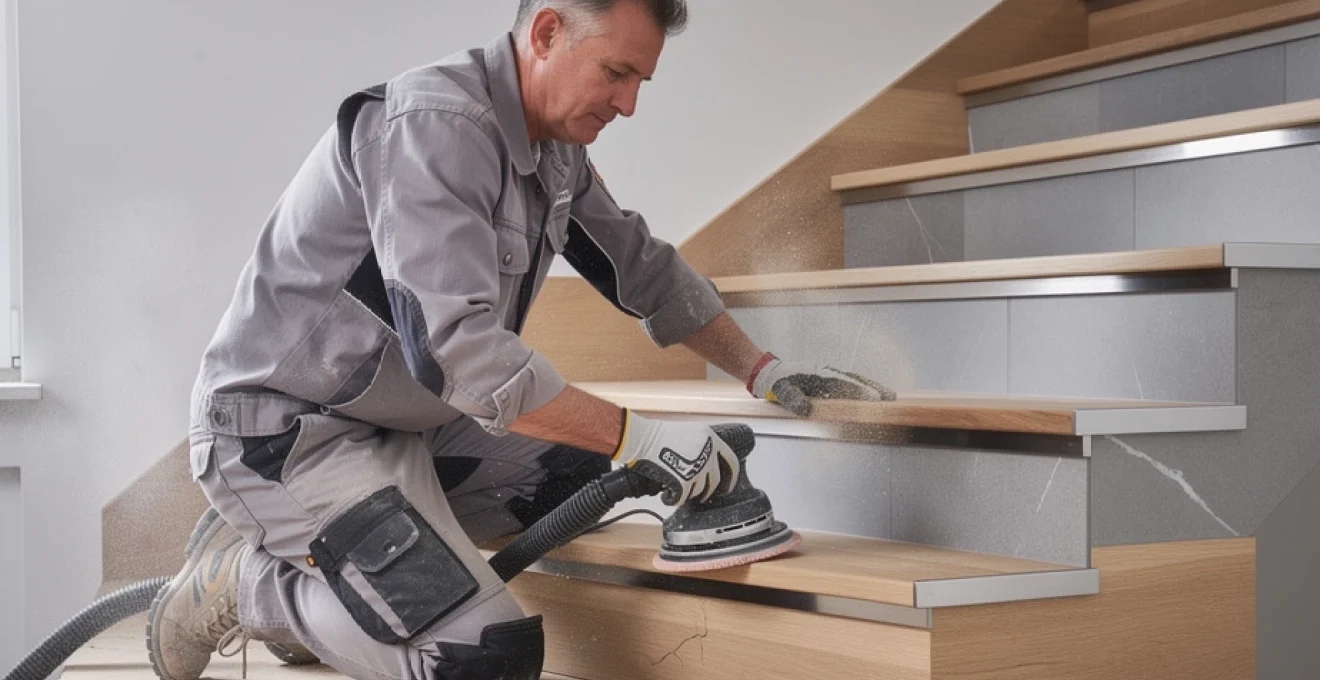 Une fois le gros du revêtement éliminé, un lessivage à l’eau tiède et au détergent neutre, suivi d’un séchage complet, prépare le support au ponçage de finition. Cette approche mixte, chimique puis mécanique, évite de surchauffer la surface par friction et limite le risque de déformation des marches, en particulier sur les essences sensibles comme le hêtre. Elle se révèle également précieuse pour dégager les profils de nez de marche moulurés ou les détails de rampe difficilement accessibles.