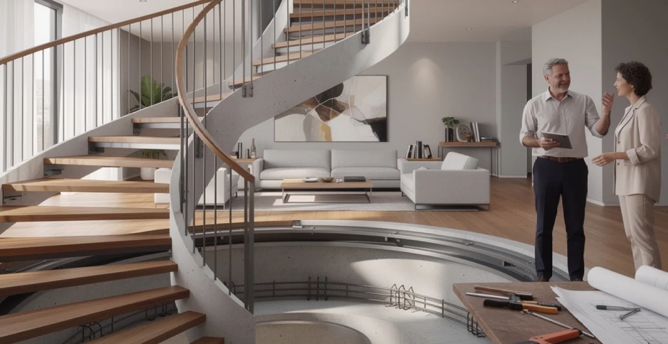 Le ferraillage joue un rôle déterminant dans la stabilité de l’ouvrage. Des armatures longitudinales suivent la courbe de l’escalier, complétées par des cadres transversaux et des ancrages puissants dans les dalles de plancher hautes et basses. Cette structure en acier répartit les efforts de torsion et de flexion induits par la géométrie en spirale. En pratique, un escalier hélicoïdal en béton combine une grande inertie structurelle à une remarquable inertie acoustique, ce qui en fait un choix privilégié pour les maisons où l’on souhaite limiter les bruits de pas et obtenir une sensation de solidité sous le pied.